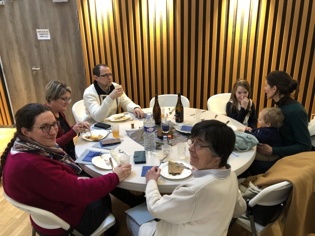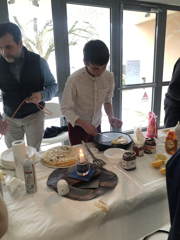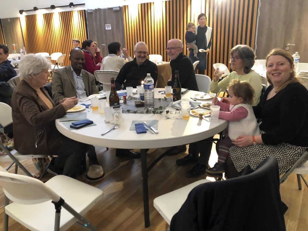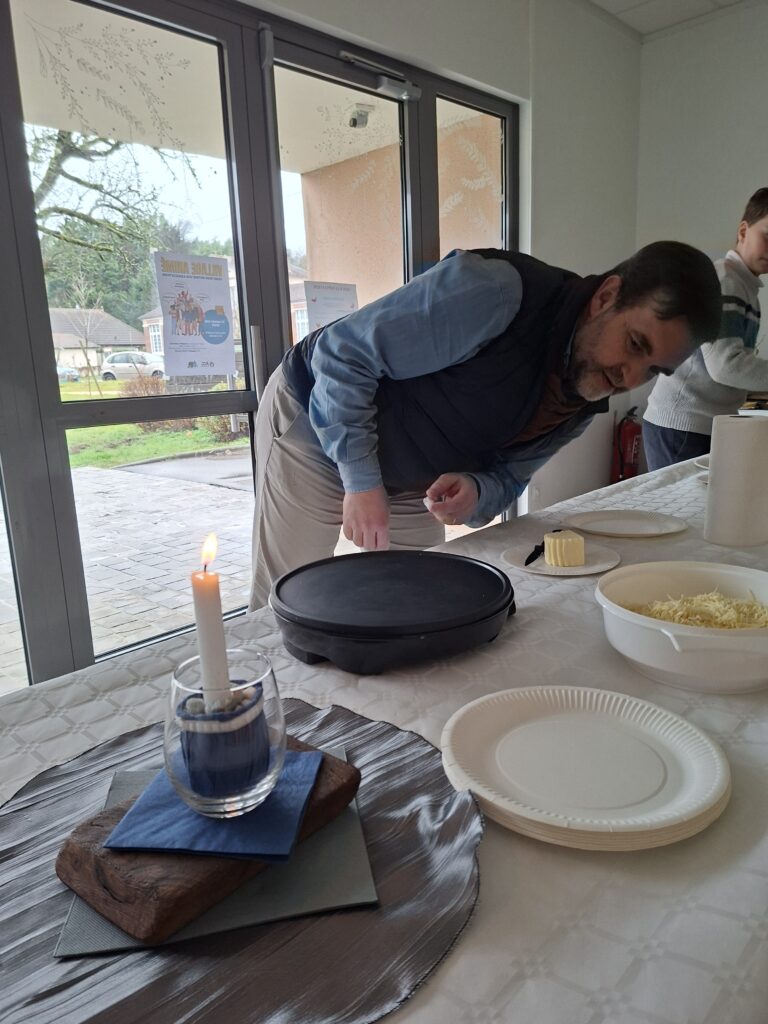 Après le benedicite, tous ont pris place autour des tables pour notre traditionnel repas-crêpes. C’est un moment de partage, de discussions, de retrouvailles ou l’occasion de faire connaissance avec de nouveaux venus.