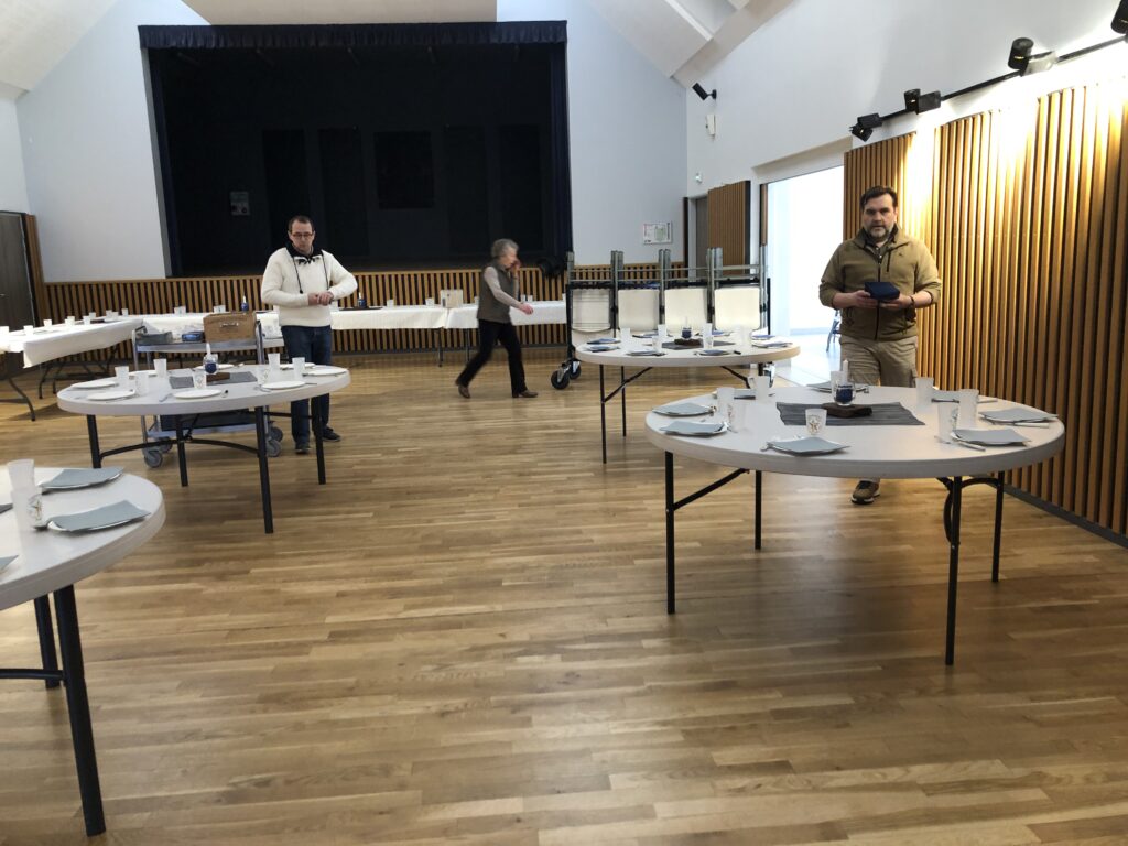 La veille de la Chandeleur, une toute petite poignée de volontaires s’est retrouvée à la salle des fêtes de Saint Hilarion, prêtée gracieusement par la municipalité, pour dresser les tables, mettre des nappes et le couvert, installer les crêpières, et disposer un joli décor de bougies au centre des tables.