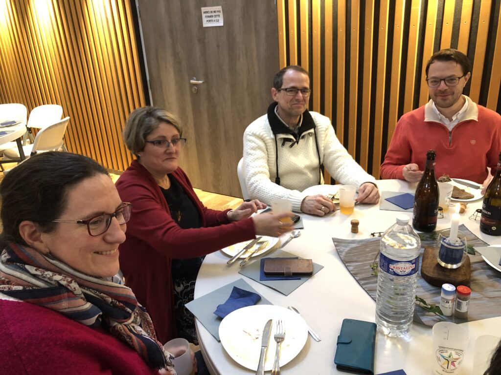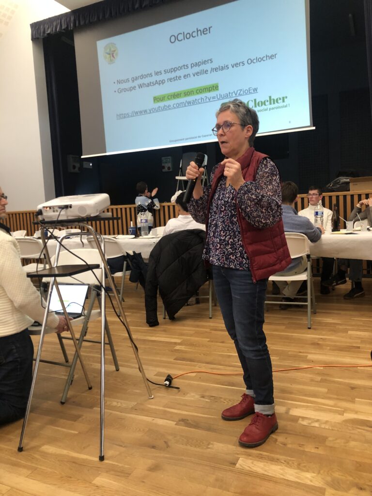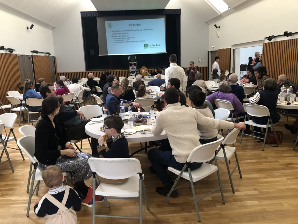 A la fin du repas, Dorothée nous a fait la promotion de l’application Oclocher qui permet de communiquer entre paroissiens et même au-delà, de partager des informations, de faciliter la vie des prêtres et des bénévoles, de ré-engager tous les chrétiens. Fraternelle, simple et intuitive, nous espérons qu’elle saura convaincre toutes les générations. C’est le réseau social des paroisses !