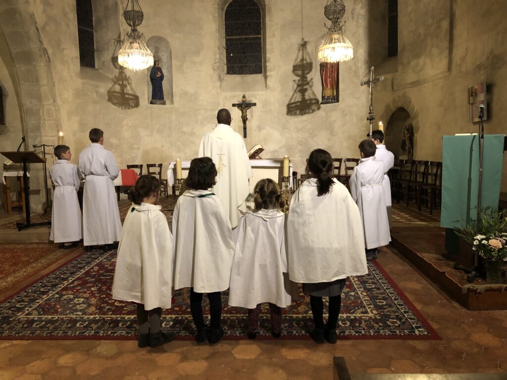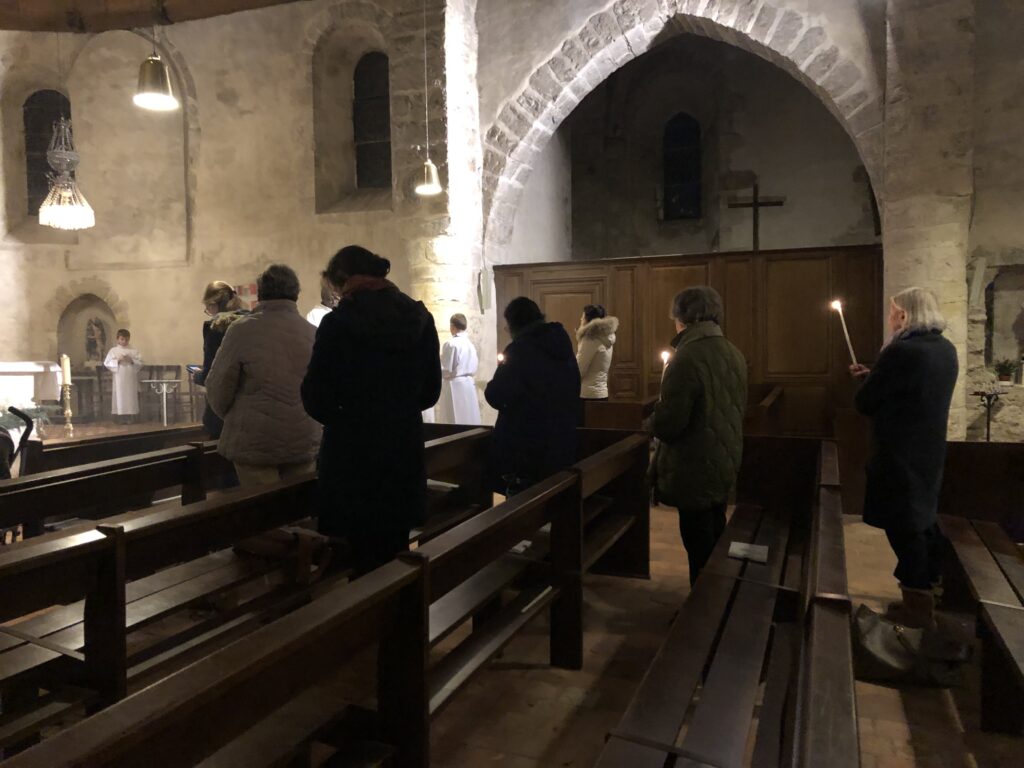 Le lendemain, vrai jour de la Chandeleur, c’est-à-dire fête de la Présentation de Jésus au Temple, nous nous sommes retrouvés à l’église de Gazeran pour  la messe précédée d’une petite procession, cierges à la main. Le prêtre a rappelé qu’il y a quarante jours, nous célébrions dans la joie la Nativité de notre Seigneur ; et que la fête d’aujourd’hui  clôture les solennités de l’Incarnation. On y célèbre en premier lieu la Présentation de Jésus, mais nous revivons aussi la rencontre de Syméon, symbole de la rencontre du Seigneur et de son peuple, dans la procession  des lumières qui a valu à ce jour le nom de Chandeleur.